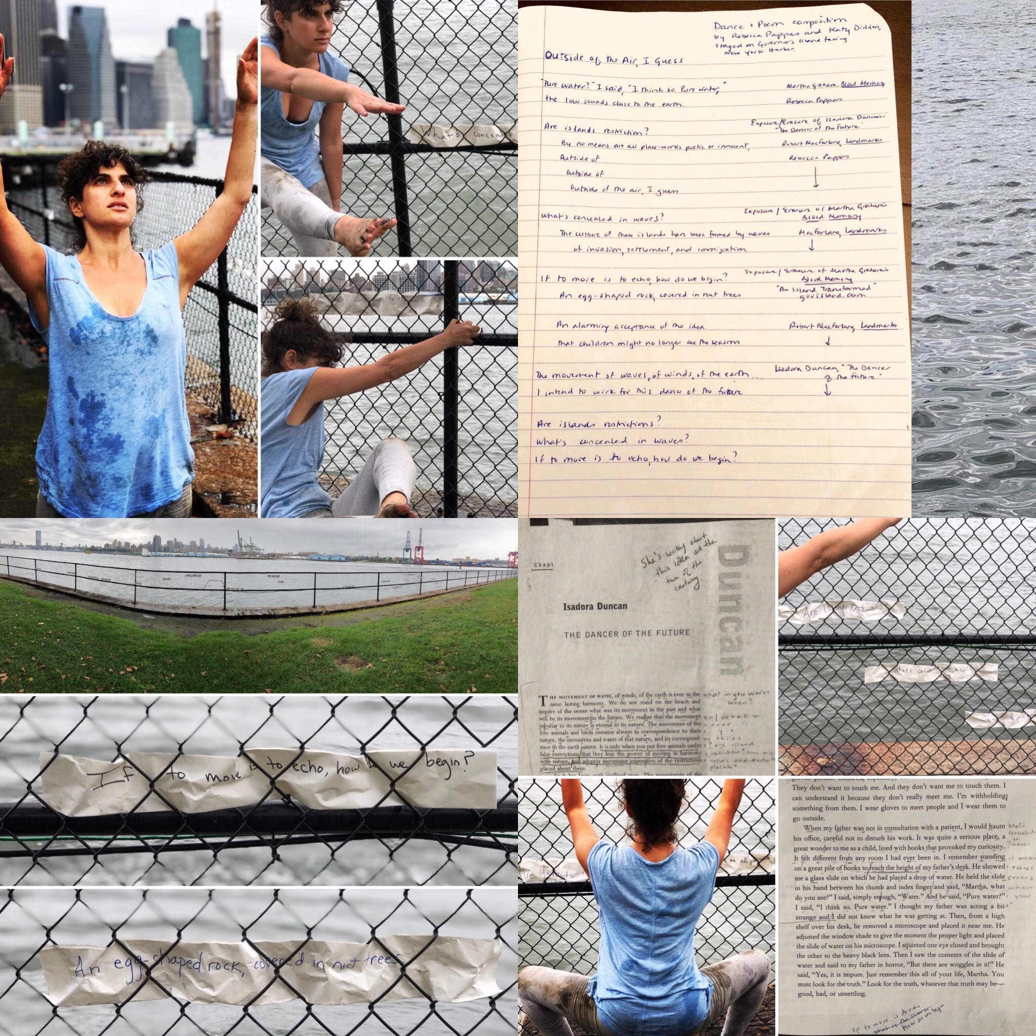 Stills from a collaborative dance + poem composed of, and in response to, quotations from and “exposures” (questions found letter-by-letter inside the sentences) of Isadora Duncan’s “The Dancer of the Future,” and Martha Graham’s Blood Memory, plus excerpts from “Landmarks” by Robert MacFarlane, “An Island Transformed” on govisland.com, and transcripts of conversations between Rebecca Pappas and Katy Didden about Governor’s Island.